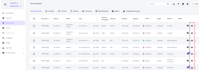 Das Buchungs-Pop-up-Fenster kann über die Buchungsliste geöffnet werden, indem du auf das Augen-Symbol hinter der Buchung klickst.