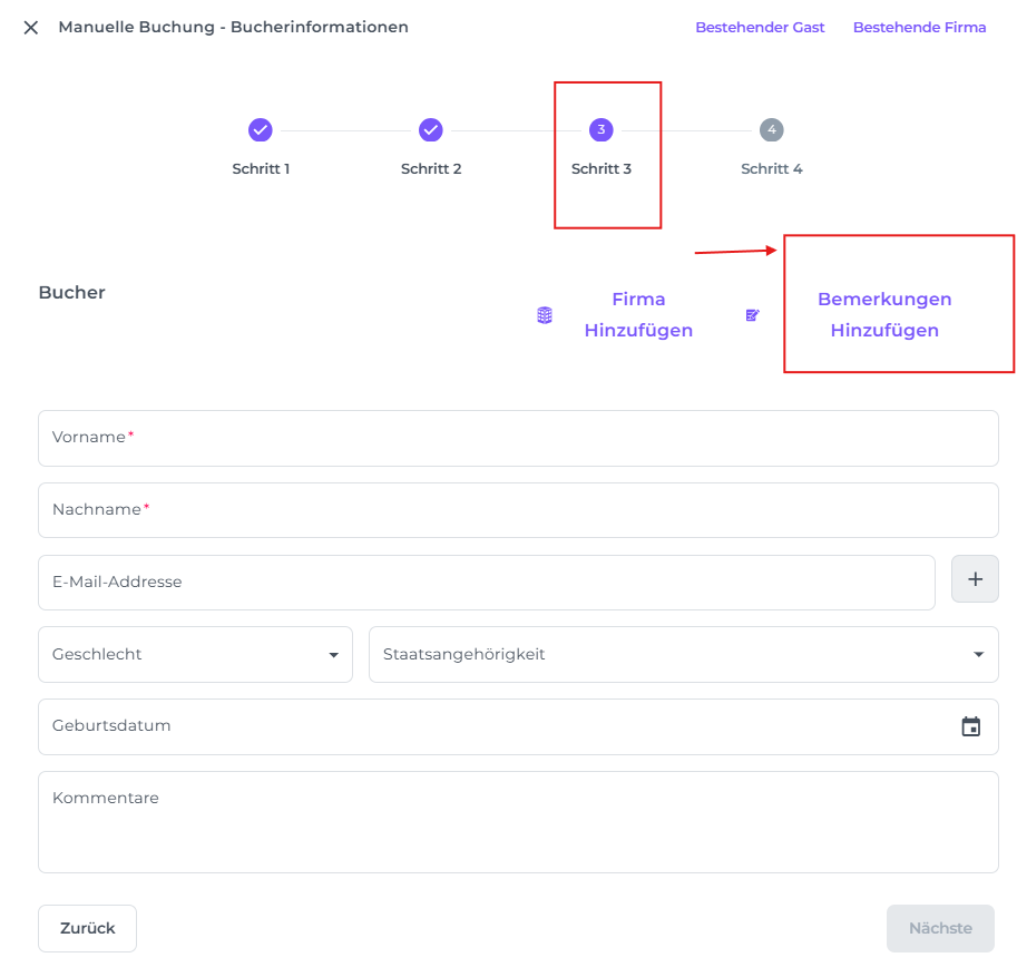 Wenn du manuell eine neue Buchung erstellst, kannst du in Schritt 3 des Prozesses Bemerkungen hinzufügen.