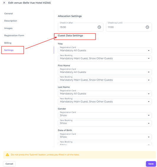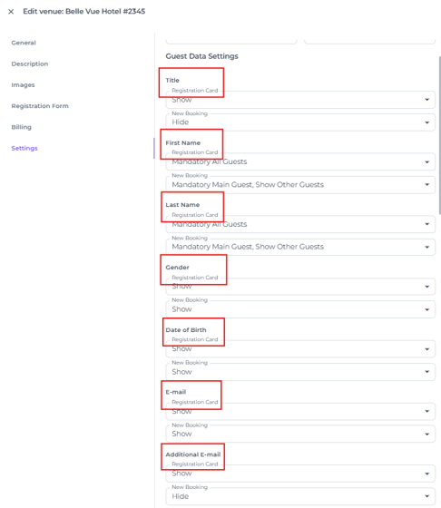 Within the Hotel Settings, you will find the 'Guest Data Settings'. The configuration of the Registration Card will be mirrored in the Online Check-in Form, ensuring both documents request the same information.