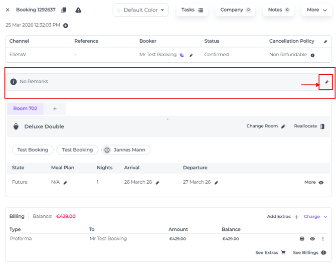 • Whilst this field is primarily intended for OTA-related comments (from either the channel or the guest), there is an option to edit them. Use the pencil icon to do so. However, editing remarks is not recommended. Please use Notes to create any internal comments.