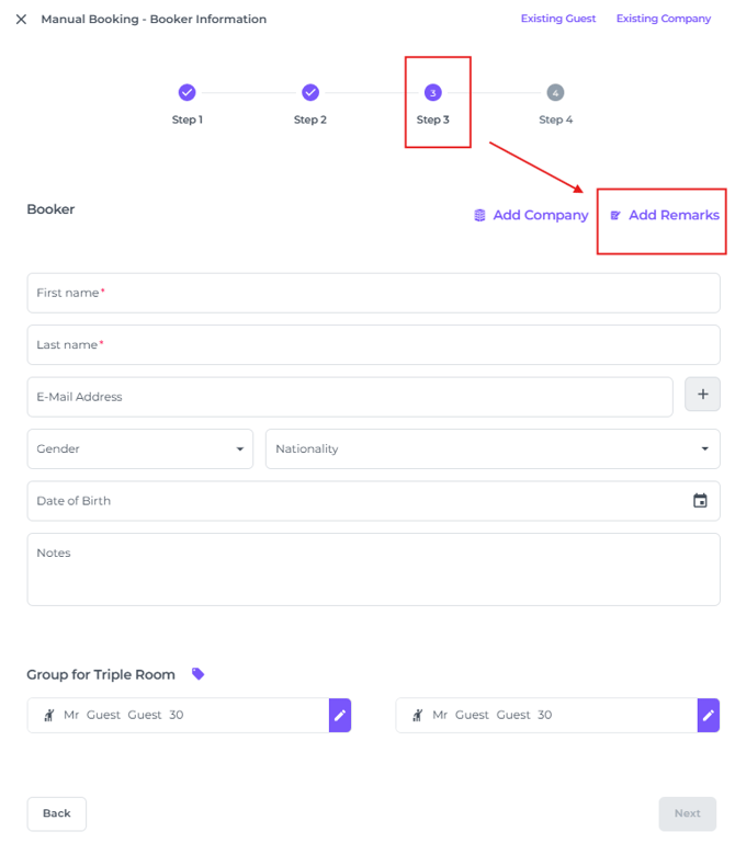 • When creating a New Booking manually, one can add Remarks in step 3 of the booking process: