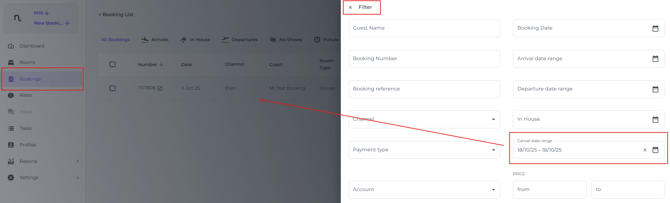 In the Booking List Filter choose 'Cancel date range' and select the desired period in which cancellations are made: