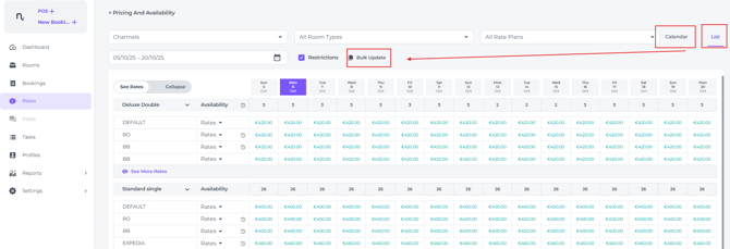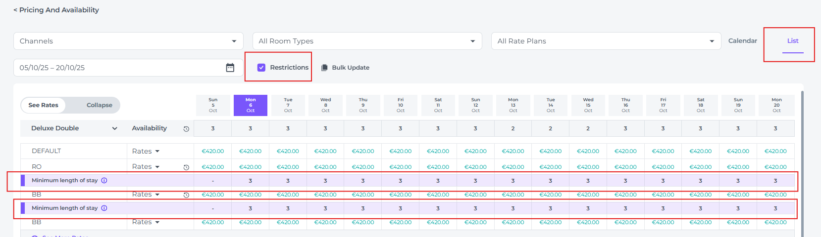 The restrictions you set will be visible in the Rates calendar, as shown in the following image for the List tab: