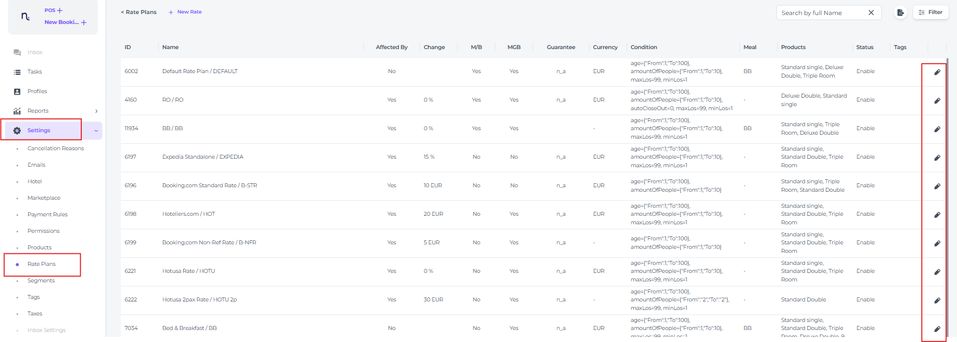 You can alternatively apply restrictions directly within the Rate Plans by navigating to Settings > Rate Plans and clicking the edit (pen) icon for the desired rate plan.