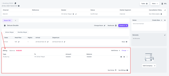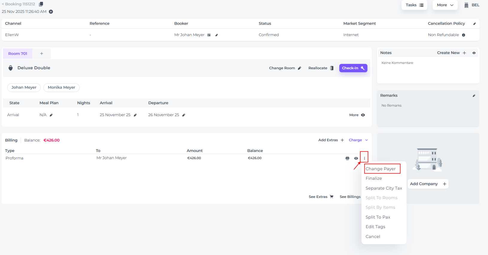 (There will be several payers to choose from, depending on what details are in the booking you will see one or more of the following entities: Guest, Company, Travel Agent.)
