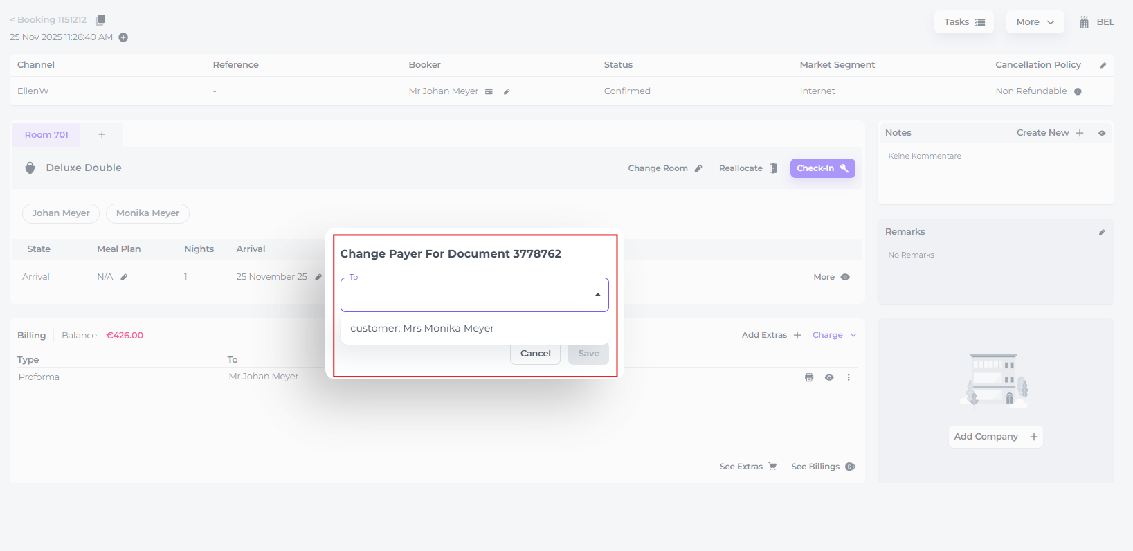 I some cases, it may be necessary to change the payer associated with a Proforma or Invoice. This can happen for various reasons, such as a customer request or to change the payer to the Company.