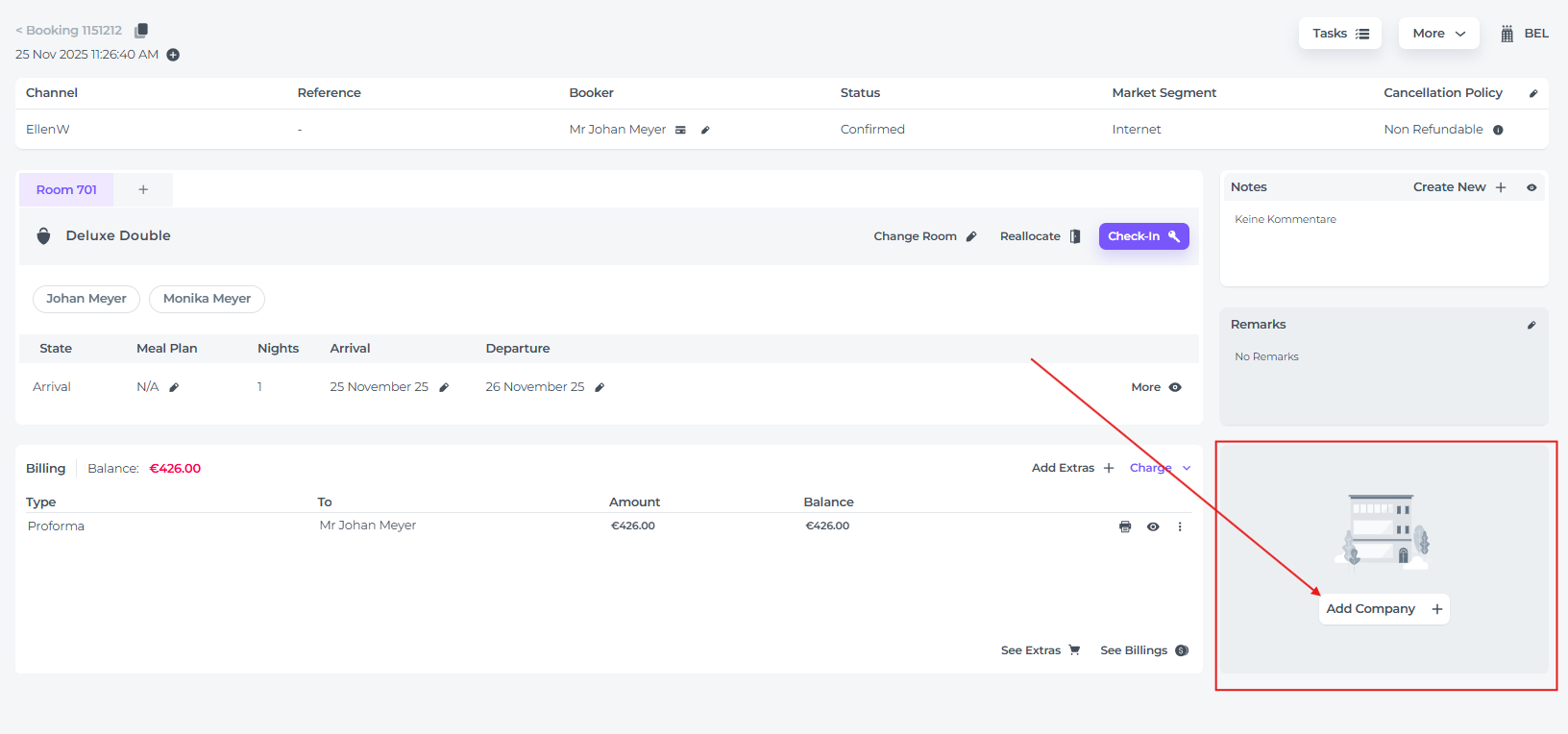 - If a Company is already added to the booking, the company name will be visible on the list of payers to choose from. If the company is not yet added, make sure you will do so first:
