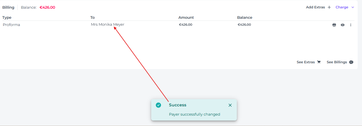 - Click on the 'More Action button' (3 dots) at the far right of the Proforma or Invoice and click on Change Payer':