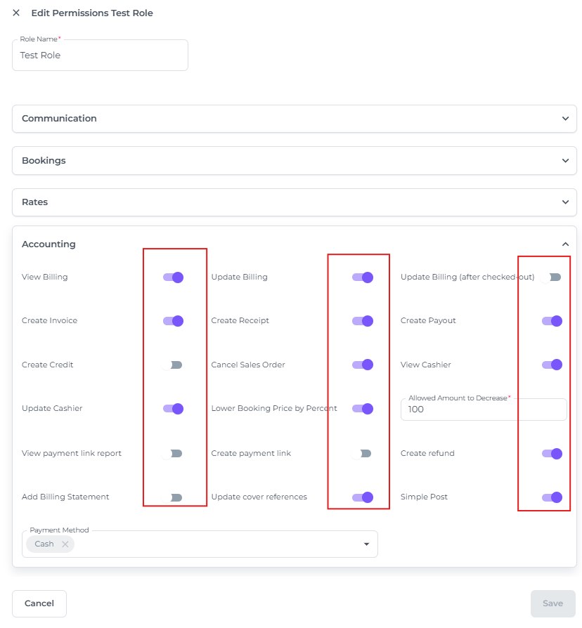 - Clicking on the arrow down on one of the categories will give you all the permissions of that specific category. Toggle on or off to change the desired permission for that role: