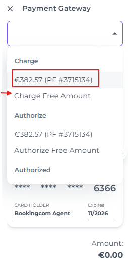 - Select the first field to indicate whether you wish to process a payment or authorise the credit card. Choose the relevant Proforma amount you want to charge, or select “Charge Free Amount” to enter a specific value you wish to collect:
