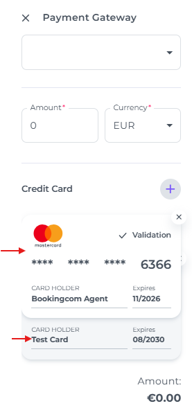 When you select this option, a pop-up window will display the credit card(s) on file. These may include the booker’s credit card used during the online reservation and/or a virtual credit card (VCC) issued by the OTA: