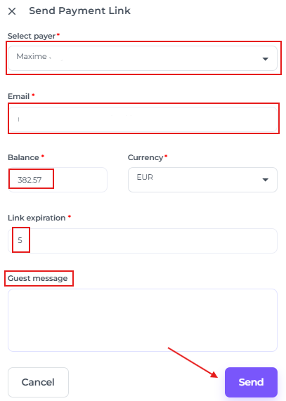 - Select the amount you would like the payer to settle. By default, this will match the outstanding balance of the booking, but you can adjust this amount as needed.