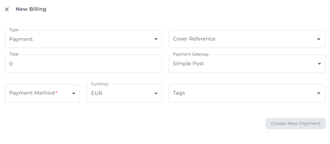- Click Create New Payment to post the payment on the Billings section of the booking.