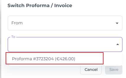 - Select the correct document (proforma or invoice) from the list and hit Save: