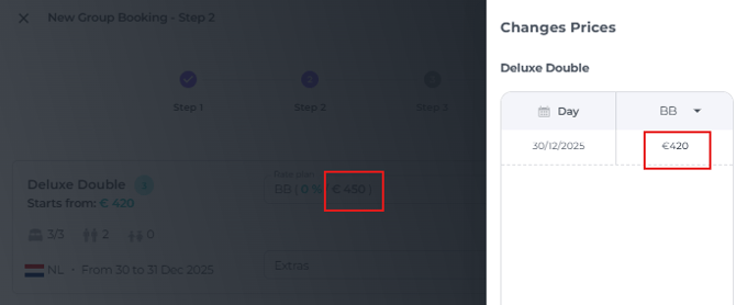 To illustrate, the image displays a scenario with a single room selected under a rate plan that includes a meal plan. The total amount shown is €450 (including breakfast), while the daily amount reflects €420 for the Room Only rate: