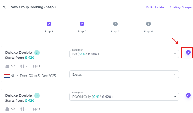 Update the rates per room per day if there are various rates applicable/ negotiated by clicking on the pen icon/amend button behind each room: