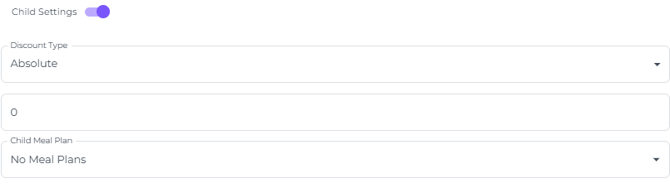 - Child Settings - When toggled on you will be able to give discounted rates for children (any person aged under 18) as well as to attach a meal plan for child breakfast (a child breakfast should be set up in the feature Meal Plans).