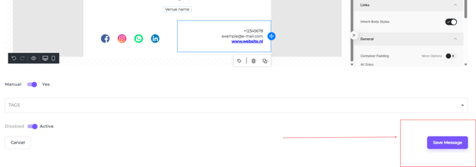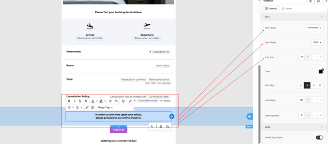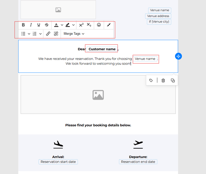 The elements with a dotted line around them will need to stay untouched! See image below: Customer Name and Venue name have a dotted line and these will automatically be prefilled according the reservation details when you send out the email from the reservation.