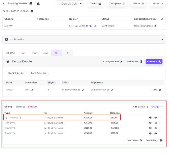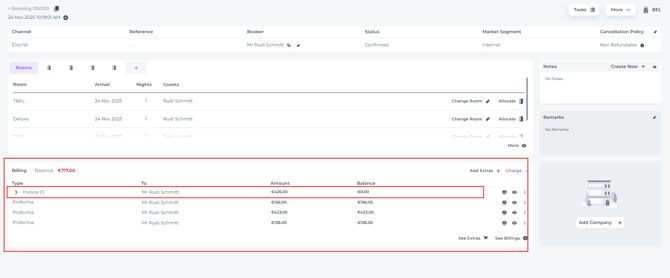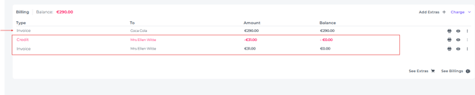 • Creating new invoices are created after crediting previous invoices, you can see them in the billing part of the reservation: