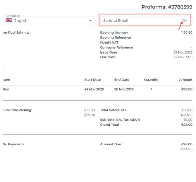 You can quickly send invoices via email directly to guests or companies. This not only streamlines your billing process and enhances professionalism, but also supports sustainability by reducing paper usage. Follow these steps to get started: