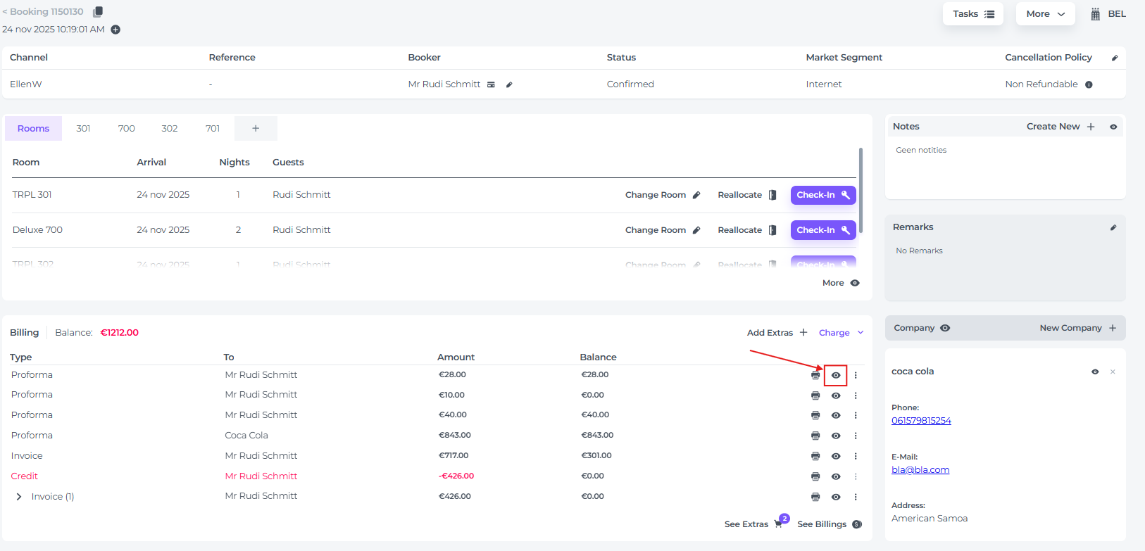 • In the Billing section of the reservation, find the invoice/Proforma that is needing to be send, and click on the eye symbol to open the concerning document: