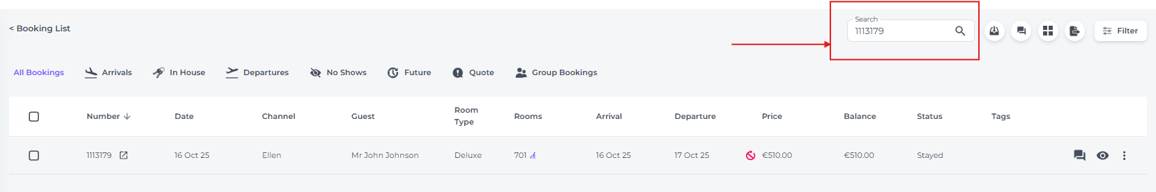 Alternatively, search by name, system booking number or reference number (Channel ID number)in the Search field on top of your Booking List screen: