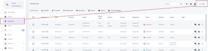 The best way to find a booking is to enter the search criteria in the Filter on the top right screen of the Booking List: