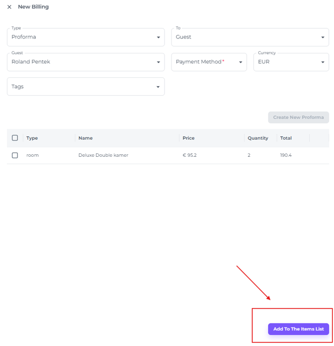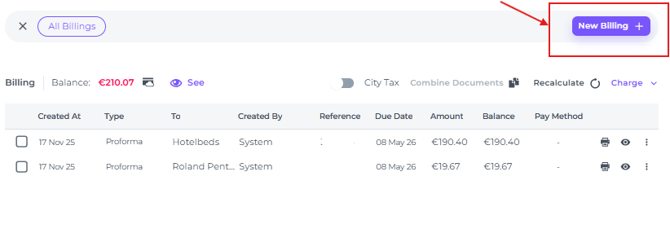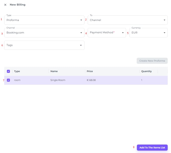 - In the New Billing pop-up screen create a new Proforma by following the steps as shown in the image below: