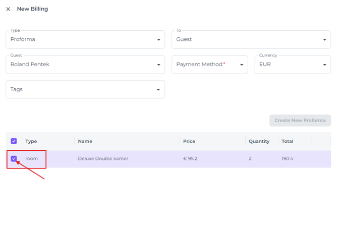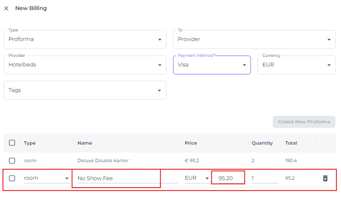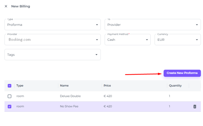 If the booking has already been cancelled, there will be no active Proforma. In that case you can skip this step ad proceed with step 3 - Create a new Proforma with No Show indicated