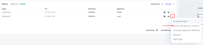 - Next, link the payment to the new proforma by clicking the three dots next to the payment and selecting ‘Switch Proforma/Invoice’.