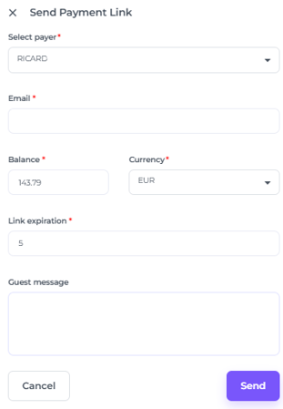 • Click Send to dispatch the payment link to the selected payer, or click Cancel to abort the process.