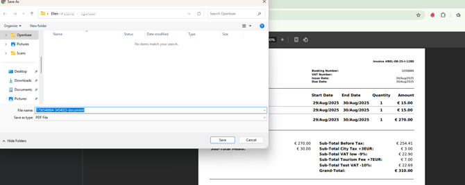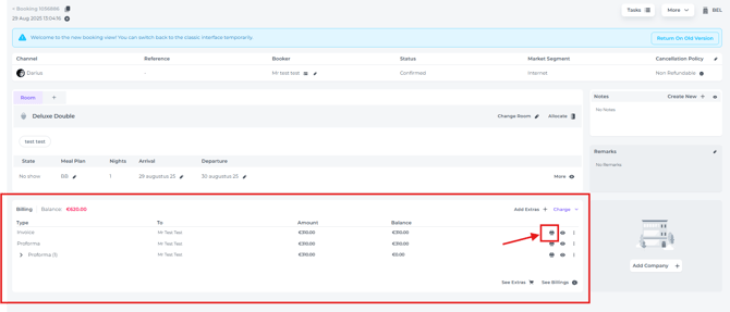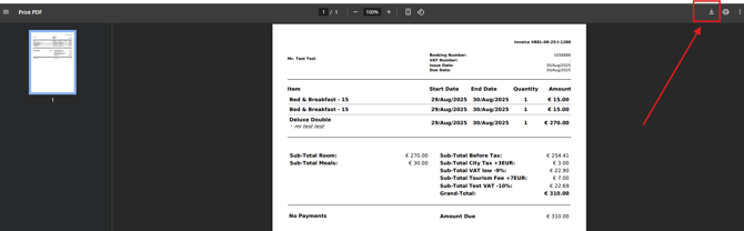 - In the Billing section of the reservation, find the Invoice/Proforma that is needing to be downloaded, and click on the Printer symbol behind it on the right side: