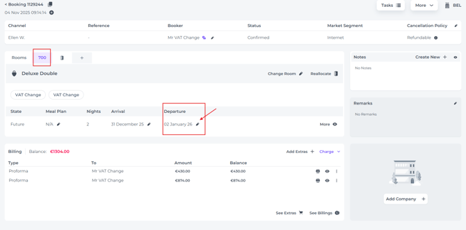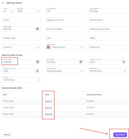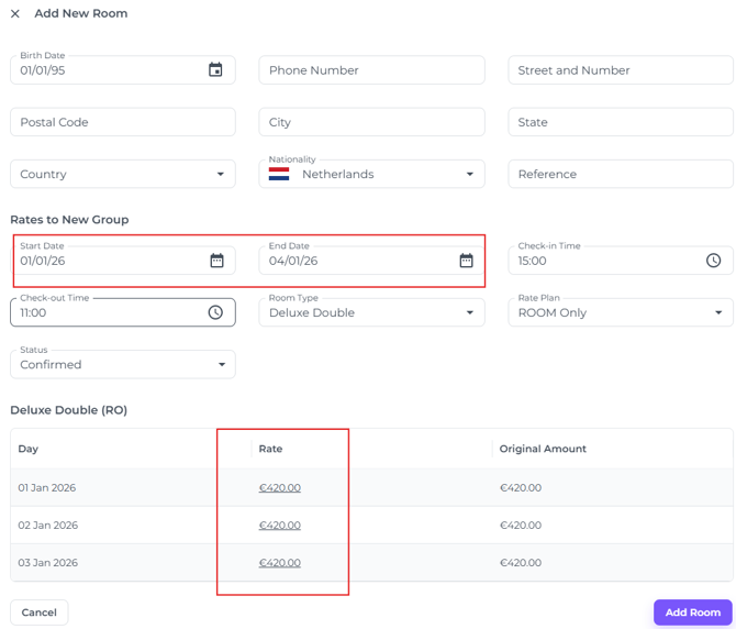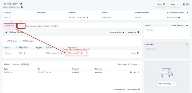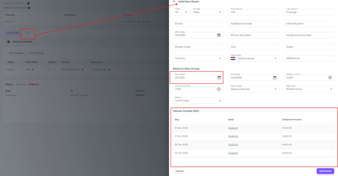 👉Before changing the original room's departure date to 01.01.26, make sure to review and note the applicable daily rates for that period. This ensures that when you add the new room, you will be able to apply the correct rates as they were at the time of the original booking.