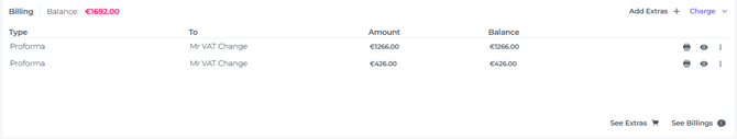 A split is now generated, resulting in two new proformas—one for each room—with the applicable VAT rates for 2025 and 2026 correctly applied.
