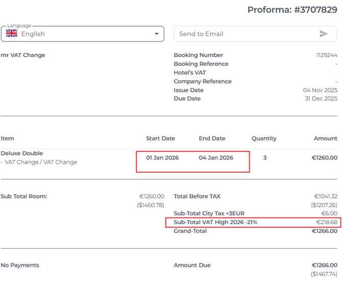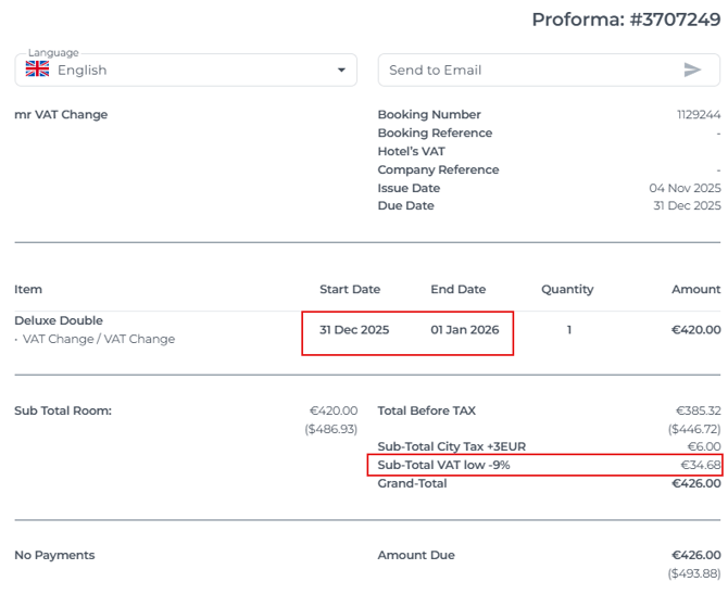 For split bookings, ensure that each proforma includes just one Room VAT: 9% VAT (low) for stays in 2025, and one Room VAT 21% (high) for stays in 2026.