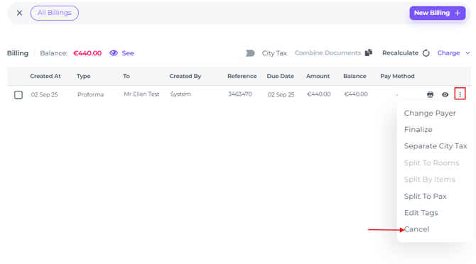 - Cancel the original Proforma by clicking on the 'More action Button' (3 dots behind the concerning proforma)and select Cancel: