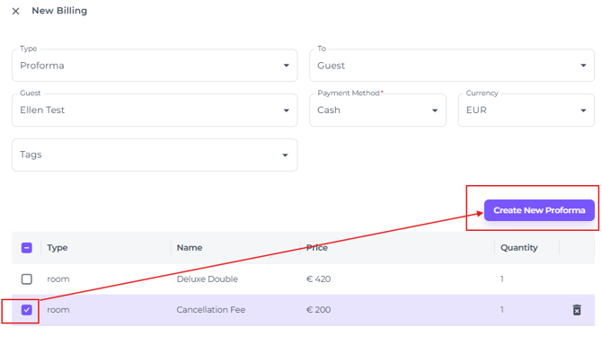 To To avoid charging City Tax/Tourist Tax you must turn the "Tourist Tax" switch ON for the New Proforma. This will create the correct Proforma invoice without this tax (the guest ultimately did not stay and therefore does not have to pay city tax):