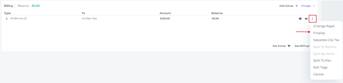 - Once you have ensured that the Proforma is correct (payer, amount, item name, etc.), you can finalise it into an Invoice by clicking on the ‘More Action’ button (three dots) next to the Proforma and selecting Finalise: