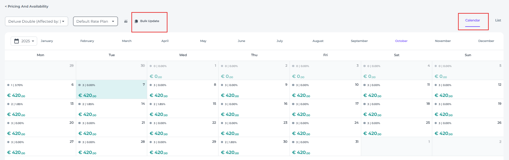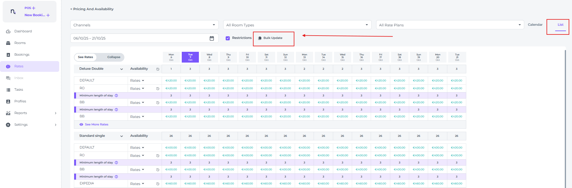 - The Bulk Update tool can be found in both List version of the Rates Calendar: