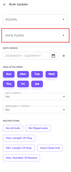 Firstly select the room type(s) that you need to make changes for: - Select the rate plan(s) that are applicable: