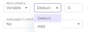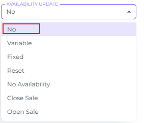 Fixed = Set a fixed rate (this approach is not recommended when selecting multiple room types with different price categories as it will result in the same price for all.): - Change Availability in the Availability Update: