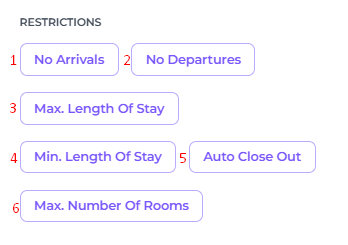 - No departures: Prevents guests from checking out on the specified dates. This means that if a guest chooses to depart on a day that falls within the period of the specified restriction, there will be no availability. However, guests can still book a stay that ends before or after the restricted period and includes the restricted dates as long as they do not depart on the specified days.