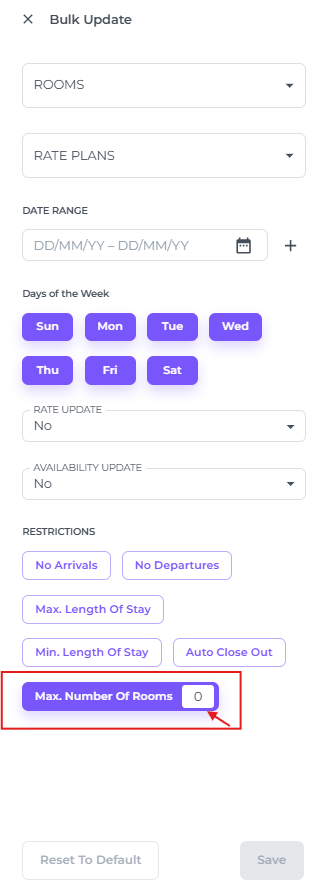 Take the following steps to set up the Max. Number of Rooms restriction via the Bulk Update feature: