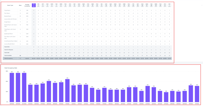 The report shows you the actual Availability (rooms left to sell) and the actual Occupancy per day (Rooms sold) in a graph for clearer visualisation. :