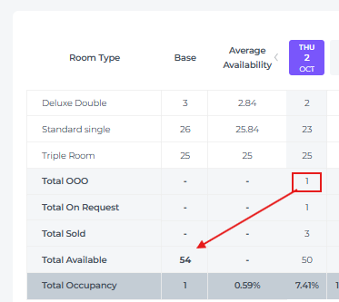 Rooms which are set Out of Order will be taken out of the inventory, therefore the Total Available Base rooms will be less: