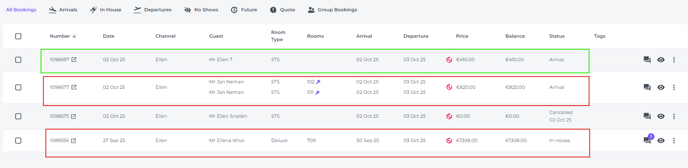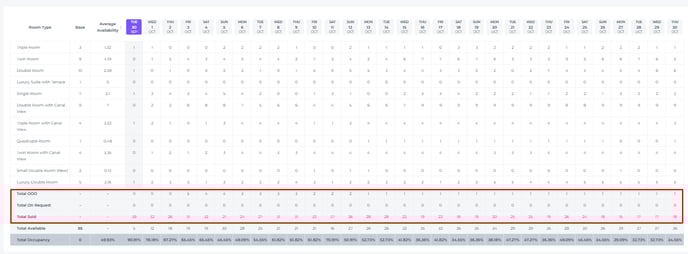 The green highlighted reservation is On Request and therefore does not count in the Total Sold Rooms: