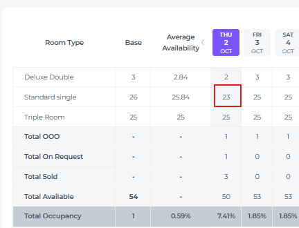 The availability shown here always displays the real-time count of rooms physically available. Even if availability is adjusted manually in the Rates section of the system.