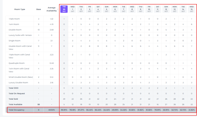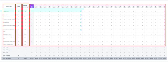 - Dates - Showing you the dates and days of the week and the availability per room type per day.