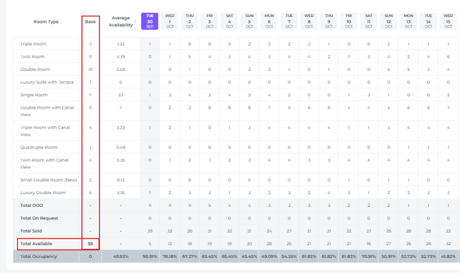 Total Available Base availability - The actual number of rooms (inventory) in your property. This total is the total of all room types combined. Therefore this property of the example below, has an inventory 55 rooms.