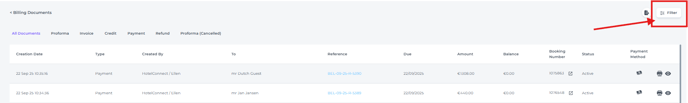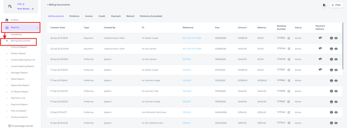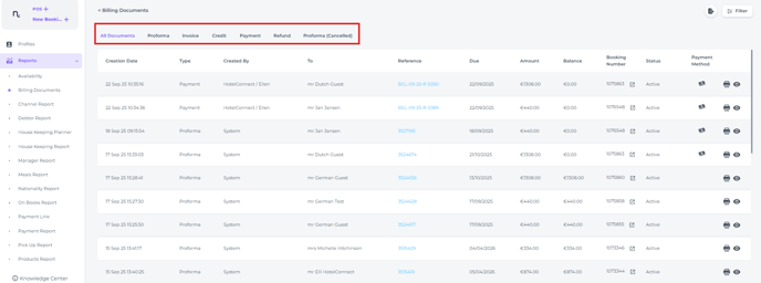 All Documents – Displays all billing records in one overview (Proforma - Invoice - Credit - Payment - Refund - Cancelled Proformas).